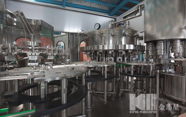 本設備主要用于含汽飲料灌裝,包含沖瓶灌裝和旋蓋三大主要功能。本設備實現全自動運行,能夠適應PET瓶含汽果汁、含汽礦泉水及可樂與雪碧等灌裝。瓶型適應性強,更換瓶型時操作簡單快捷。灌裝方案中采用了等壓灌裝原理,灌裝快速穩定,液位準確,含汽量足。與同類設備相比,本公司產品產量高,運行穩定安全,故障率低,自動化長度高,價格經濟實惠。全機采用優良可編程控制器(PLC)來控制設備的自動運行,送瓶系統由變頻器改變速度,更加穩定可靠。每個部分都有光電單元進行監測,所以更加自動化,操作更加便捷。在此基礎上,更換灌裝單元即可改變灌裝模式到低壓真空灌裝和等壓灌裝等。本設備是飲料企業的選擇。
