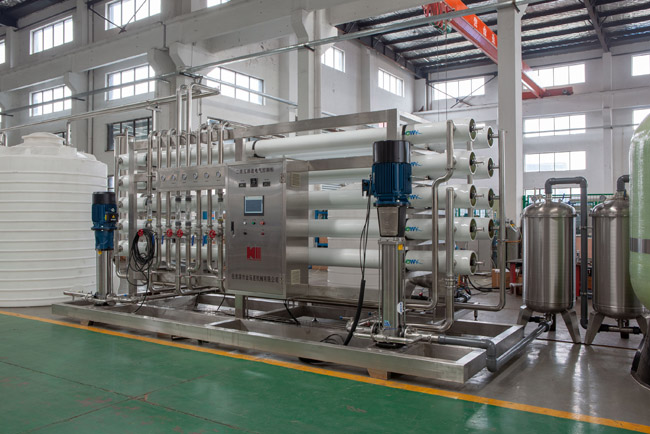 電除鹽實(shí)際上就是在電滲析的陰、陽(yáng)離子膜隔室的脫鹽室中加入樹(shù)脂,作為脫鹽隔室。在膜堆兩端加直流電產(chǎn)生電位差,它使原水中的陽(yáng)離子向陰極方向移動(dòng)并穿過(guò)陽(yáng)膜,使陰離子向陽(yáng)極方向移動(dòng)并穿過(guò)陰膜,從而使陰、陽(yáng)離子進(jìn)入濃縮室隨濃水排走。隨著脫鹽室水電阻率的升高,在近膜層發(fā)生極化,水被電離分解成H+和OH-,脫鹽室內(nèi)的樹(shù)脂經(jīng)常處于再生狀態(tài),實(shí)現(xiàn)連續(xù)深度脫鹽填充的離子交換樹(shù)脂是一種特制高導(dǎo)電率的樹(shù)脂,其導(dǎo)電能力要比低濃度水電導(dǎo)率大得多。樹(shù)脂顆粒不斷發(fā)生離子交換作用而構(gòu)成離子通道,使脫鹽室內(nèi)電導(dǎo)率增大,從而減弱電滲析器的極化現(xiàn)象,提高了電滲析器的極限電流,亦即提高了脫鹽能力。由于脫鹽隔室添加了樹(shù)脂使水流攪拌作用增大,促進(jìn)了離子擴(kuò)散,使脫鹽室電導(dǎo)率增大,提高了極限電流密度和電流效率,有助于深度脫鹽。當(dāng)EDI設(shè)備的運(yùn)行電流超過(guò)極限電流時(shí),在膜和樹(shù)脂附近的界面層會(huì)產(chǎn)生極化,水解產(chǎn)生OH-和H+,它可使樹(shù)脂再生。EDI設(shè)備在運(yùn)行中,水中的鹽分通過(guò)電滲析過(guò)程脫鹽和通過(guò)陰、陽(yáng)樹(shù)脂交換脫鹽,還會(huì)因樹(shù)脂再生使水質(zhì)變壞,經(jīng)過(guò)調(diào)試選擇適當(dāng)條件就能產(chǎn)生高質(zhì)量的純水。